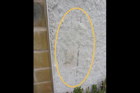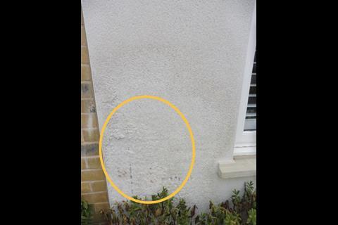 As the render coat is part of the waterproof envelope, its correct application is essential for watertightness. Render that has been incorrectly applied, in this case being of insufficient thickness, could lead to water ingress through the external wall. On the site pictured above, weep holes were also missing above openings, which could cause water ingress around the internal window and door reveals.