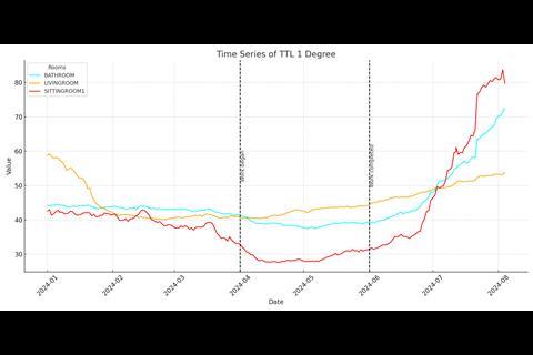 The data revealed the root causes of the property’s poor energy performance. The average Time to Lose 1 Degree (TTL) of heat was just 28 minutes, meaning the home was losing heat rapidly across the three rooms monitored: the bathroom, family room, and green room. This TTL value can be used to compare heat loss between different properties, making it a valuable metric for identifying homes that need energy efficiency improvements. The data also pointed to a high risk of damp and mould, both of which are exacerbated by poor ventilation and contribute to an unhealthy living environment.