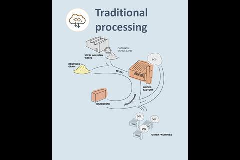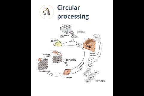 The fine residual product from metal slag (from steel production) is converted by adding CO2 to high-quality building materials. The carbonates that form result in the entire brick having a hard, limestone-like bond.
